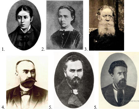 Ниже приведены изображения «известных» в России деятелей последней трети XIX в. – начала XX в. Назовите человека, который является исключением из ряда представленных ниже деятелей, и напишите номер его изображения. Напишите термин, который объединяет всех представленных деятелей, за исключением одного. Напишите термин, который объединяет их всех без исключения. Ваши ответы должны быть связаны между собой по смыслу.