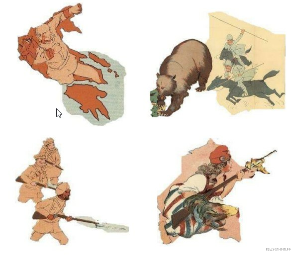 Рассмотрите фрагменты карикатурной карты Европы, вышедшей в свет в начале Первой мировой войны. На них изображены государства — участники войны.
